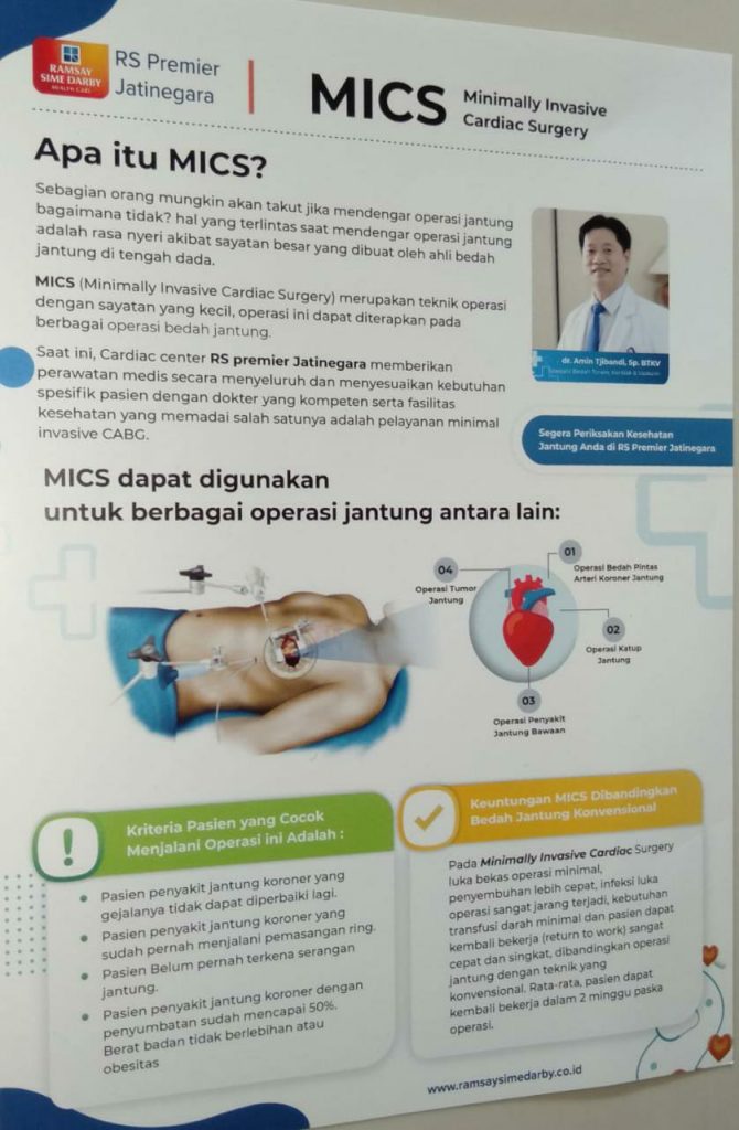 dr. Amin Tjubandi, Sp.BTKV(K), dokter spesialis bedah toraks, kardik dan vaskuler memaparkan, “Minimally Invasive Cardiac Surgery (MICS) merupakan inovasi terkini dalam teknik bedah jantung, dimana metode pembedahan menggunakan sayatan kecil. Sehingga kehilangan darah lebih sedikit, mengurangi ketidaknyamanan paska operasi, waktu penyembuhan lebih cepat, menurunkan risiko infeksi, serta menghilangkan kemungkinan infeksi luka dalam sternum.”