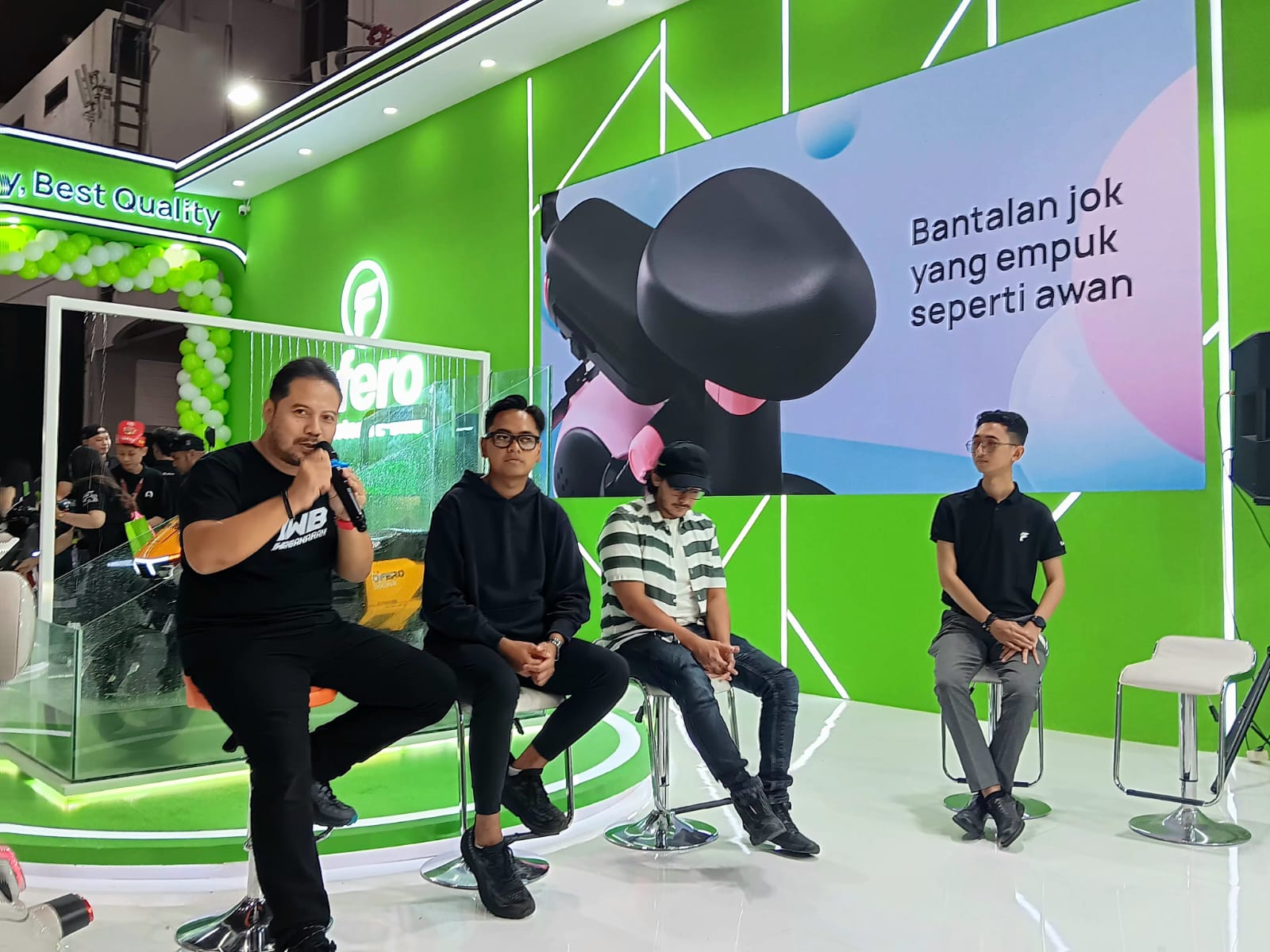 (Paling kiri) Iwan Banaran memberikan testimoni tentang pengalamannya melakukan test ride sepeda listrik bergaya motor produk unggulan OFERO tipe Stareer 3 Lit di ajang Jakarta Fair 2025, Kamis (19/6/2025).
