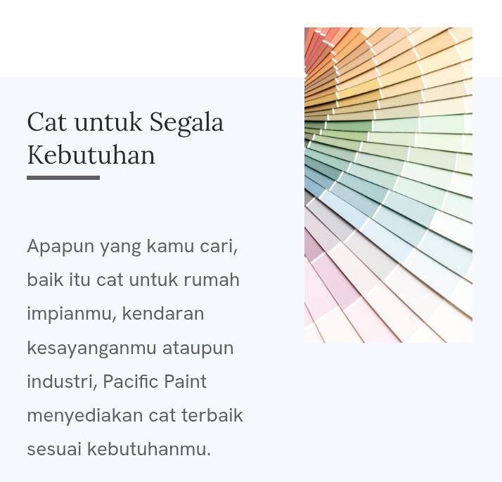 Pacific Paint merupakan produsen cat yang telah hadir selama 82 tahun (sejak 1943) dan memiliki rangkaian produk untuk menjawab solusi atas segala kebutuhan pengecatan dengan mengangkat tema warna terinspirasi dari warna alam Indonesia.