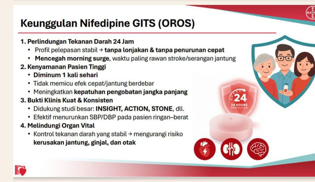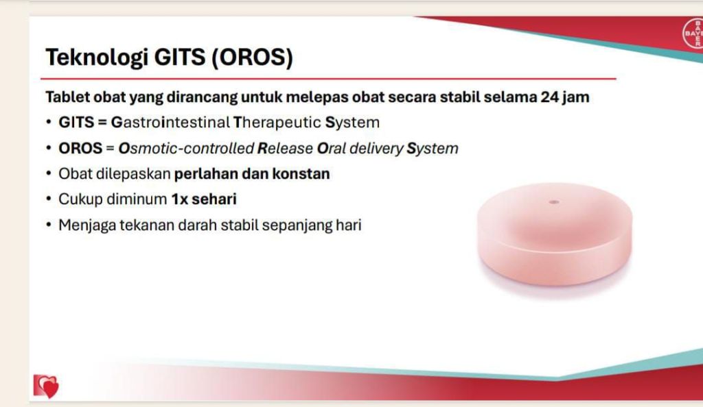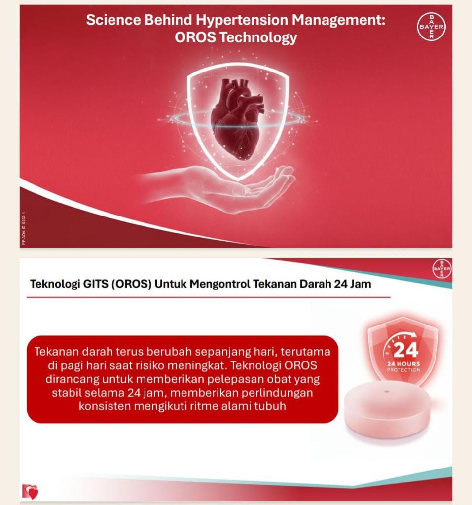 Sebagai perusahaan global berbasis sains, Bayer menyediakan obat inovatif yang dirancang menjaga kestabilan tekanan darah sepanjang hari. Salah satunya melalui pemanfaatan teknologi Osmotic-controlled Release Oral Delivery System (OROS) pada Nifedipine GITS yang memungkinkan pelepasan obat secara stabil selama 24 jam, melindungi pasien dari morning surge dan menjaga tekanan darah tetap terkontrol.