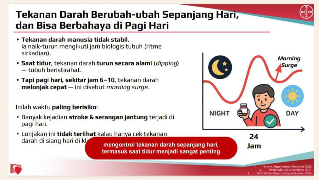 Dalam momentum Hari Kesehatan Nasional, Bayer Indonesia kembali menekankan pentingnya edukasi publik mengenai manajemen hipertensi melalui sesi “The Science Behind: The Importance of 24-hour Hypertension Management.” Program ini membahas pendekatan ilmiah dalam pengendalian tekanan darah sepanjang 24 jam, termasuk risiko morning surge, lonjakan tekanan darah tajam yang terjadi pada pagi hari.